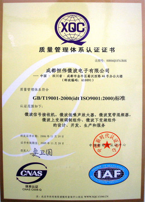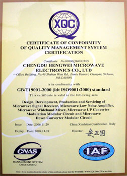 質(zhì)量保證:恒偉微波以通過(guò)了GB/T19001-2000質(zhì)量管理體系認(rèn)證和GJB9001A-2001軍工質(zhì)量體系認(rèn)證。,并嚴(yán)格遵循質(zhì)量體系認(rèn)證,把質(zhì)量體系貫穿到公司產(chǎn)品的開(kāi)發(fā)、生產(chǎn)和銷售當(dāng)中。